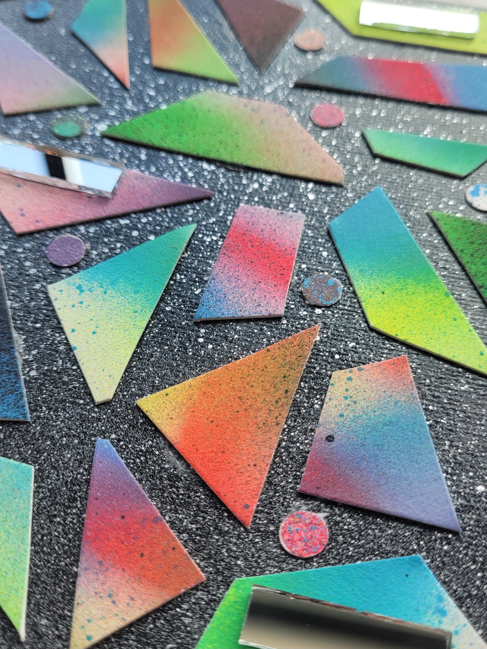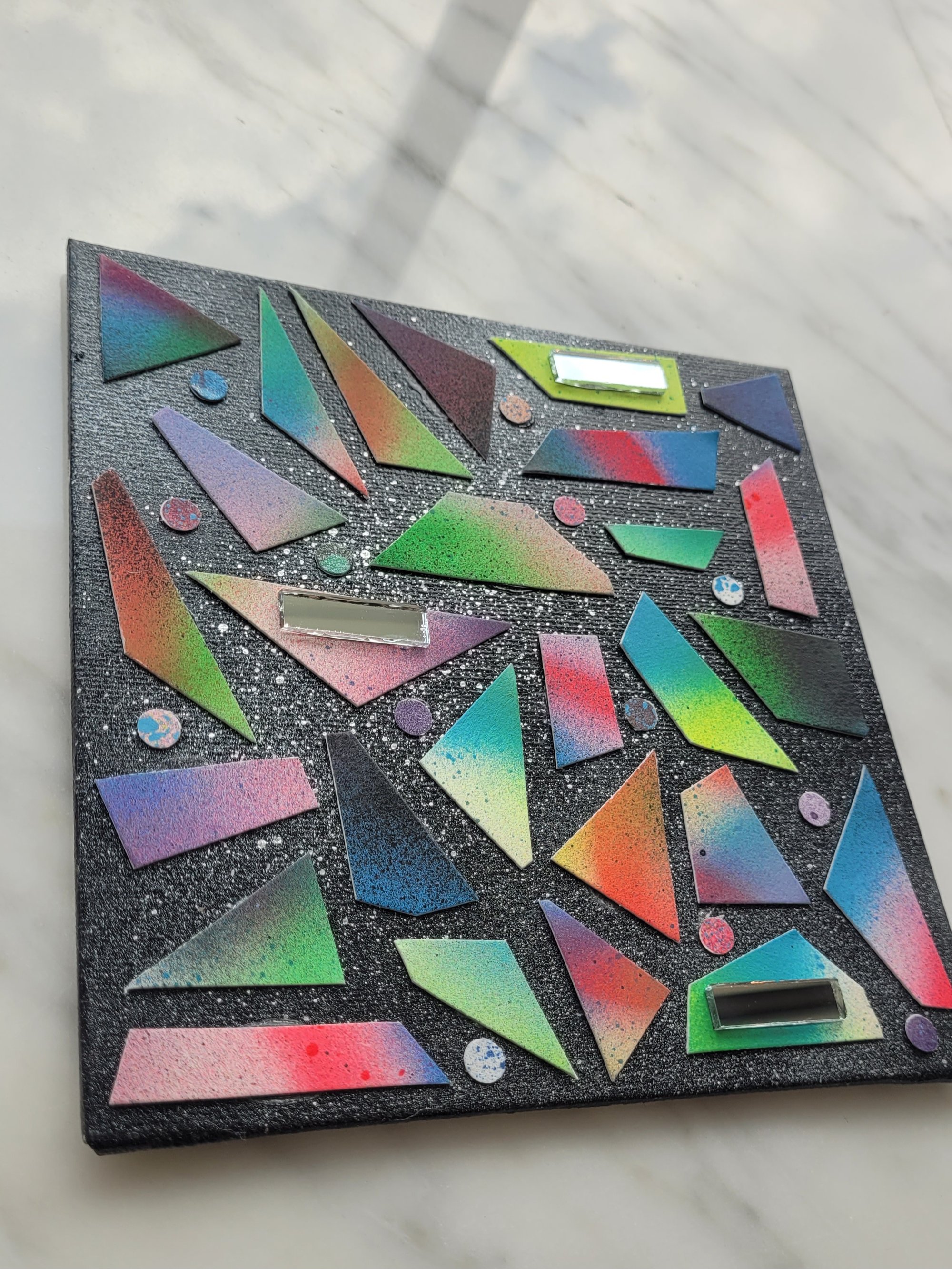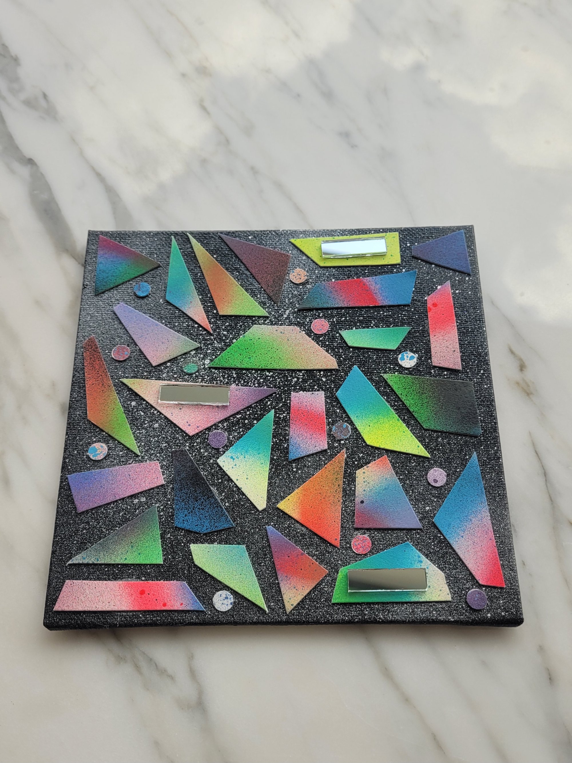 6"x 6" mixed media collage made with pieces from previous paintings combined with small mirrors to represent reflection & light.