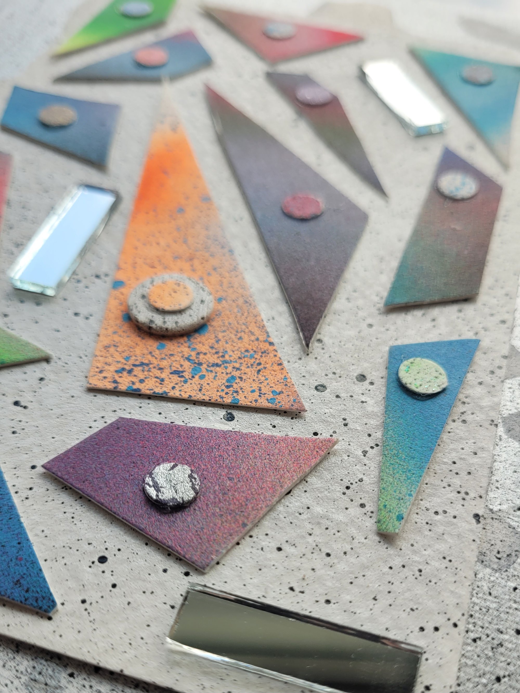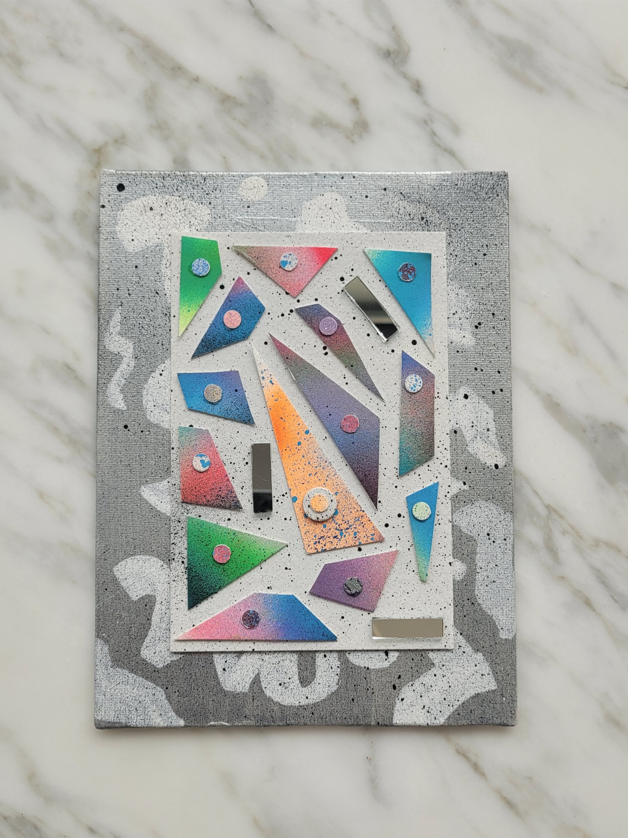 6"x8" mixed media collage made with pieces of wood & paper from previous paintings, combined with small mirrors to represent reflection & light.