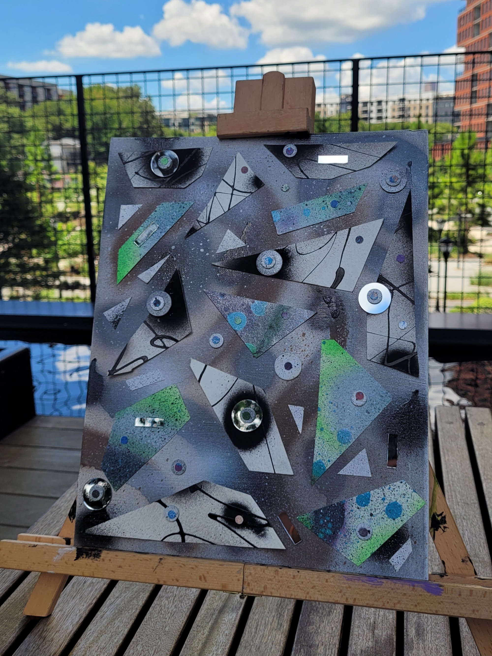 11"x 14" mixed media collage made with pieces of wood & paper from previous paintings, combined with small mirrors to represent reflection & light.