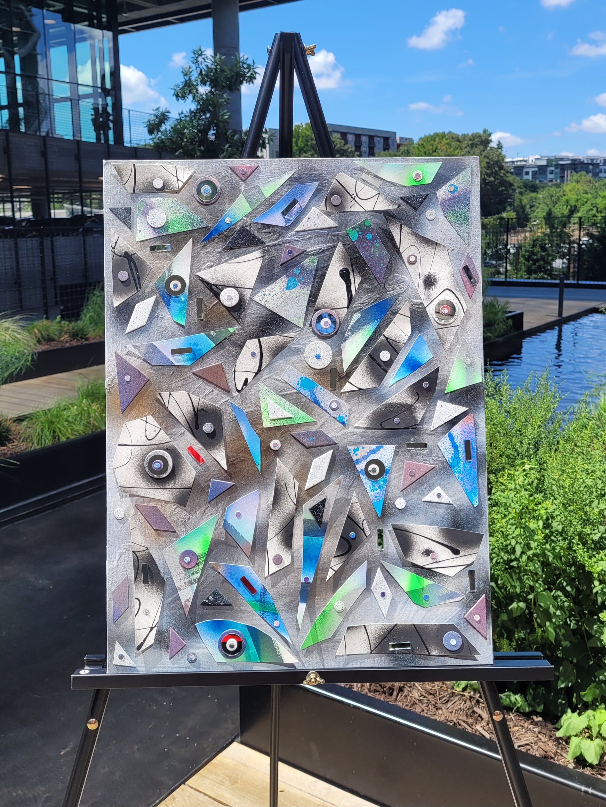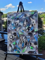 18"x 24" mixed media collage made with pieces of wood & paper from previous paintings, combined with small mirrors to represent reflection & light.